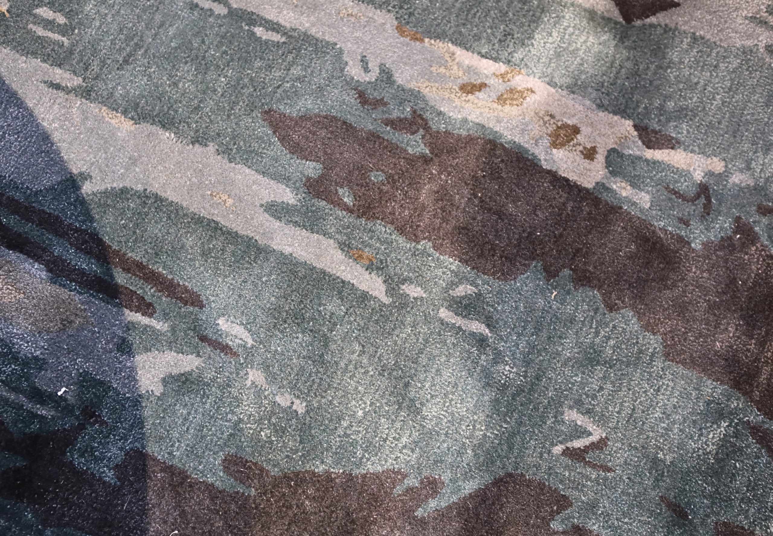 Its abstract pattern unfolds like a painterly landscape, gentle teal washes meet deeper charcoal and neutral accents, creating a composition that feels both dynamic and considered. The interplay of colour and texture anchors seating areas while maintaining visual openness, making the rug a natural foundation for curated living spaces.