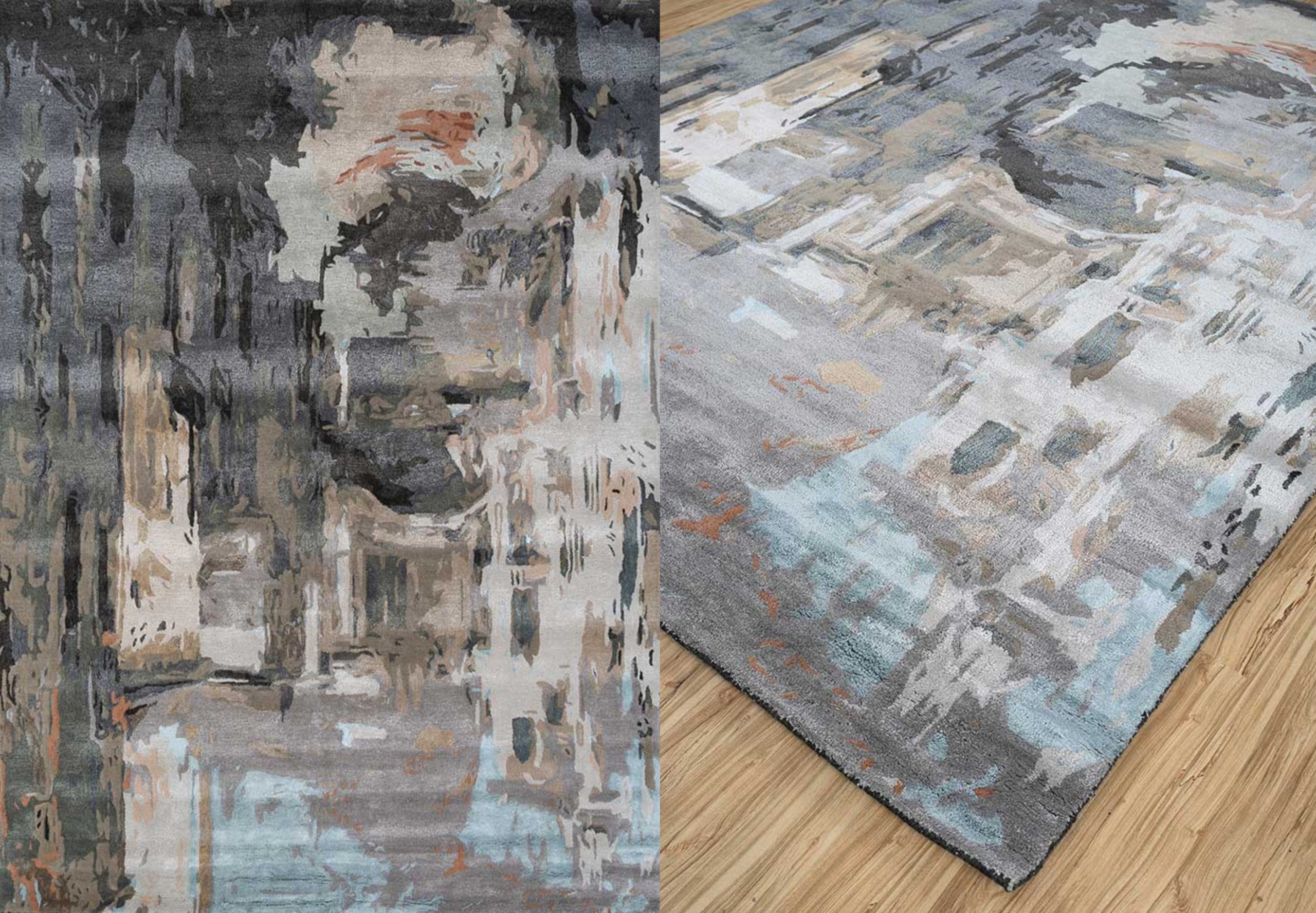 A hand-tufted abstract rug with soft teal, charcoal, and earth tones, designed to ground contemporary interiors with depth, texture, and subtle movement.