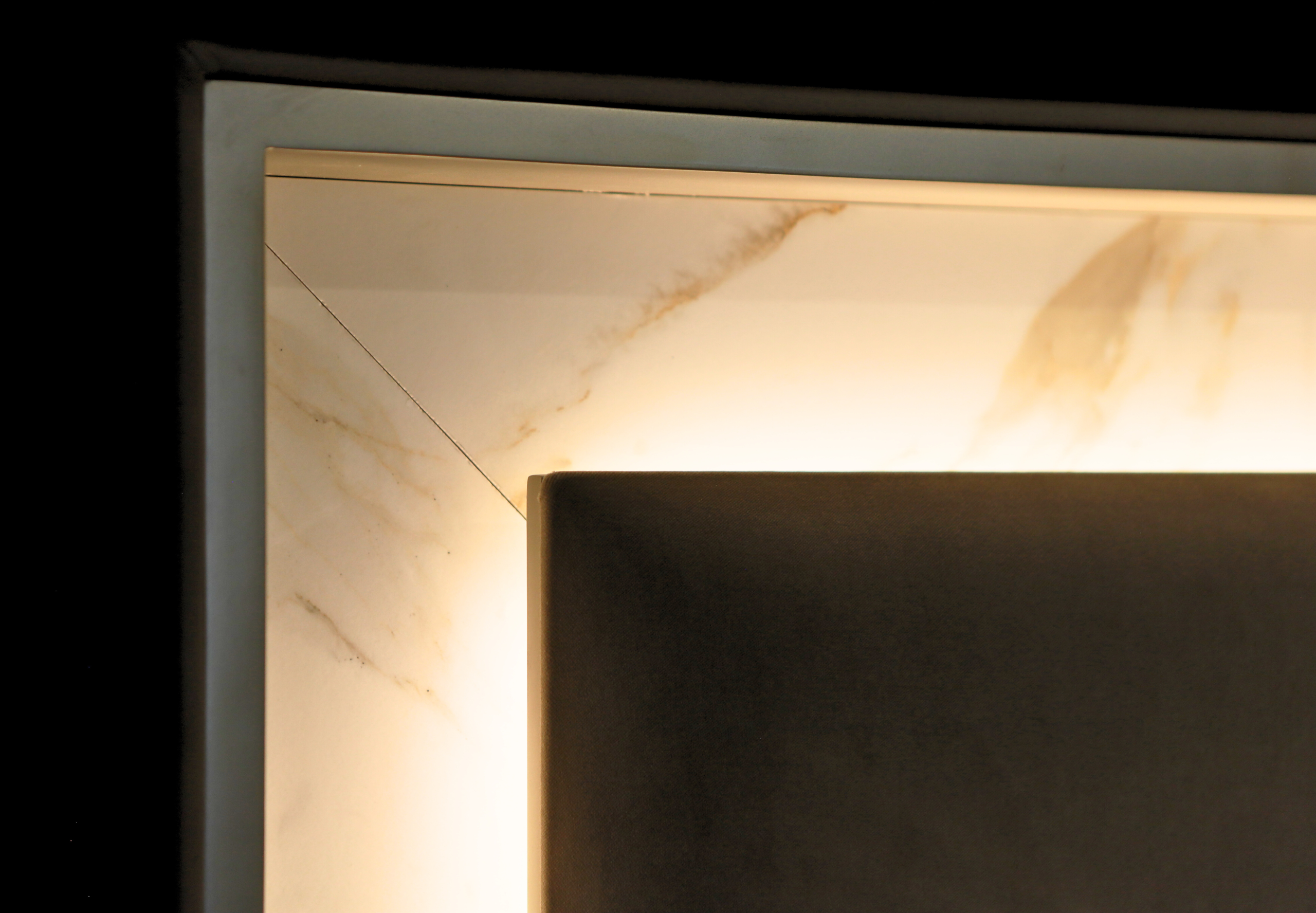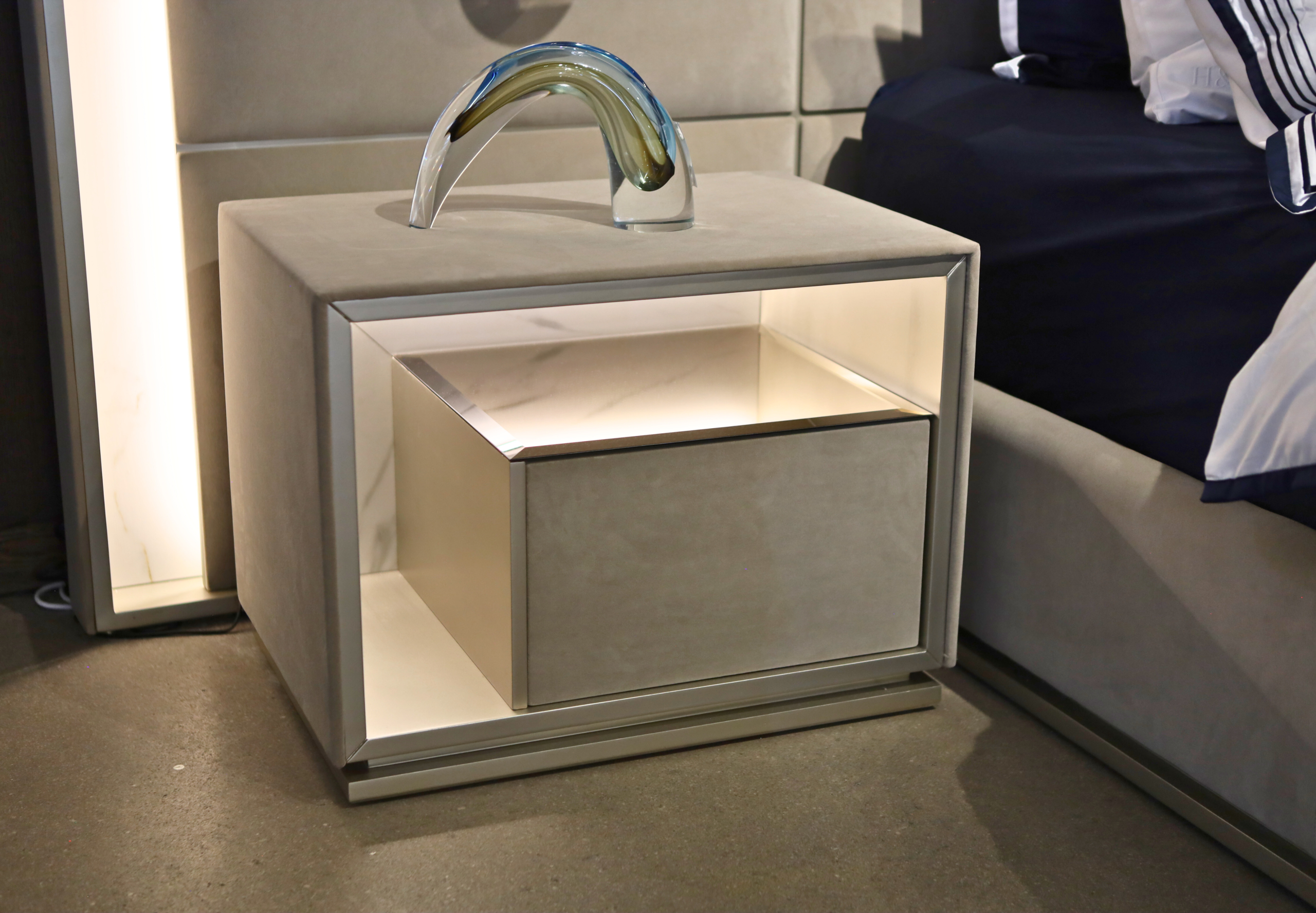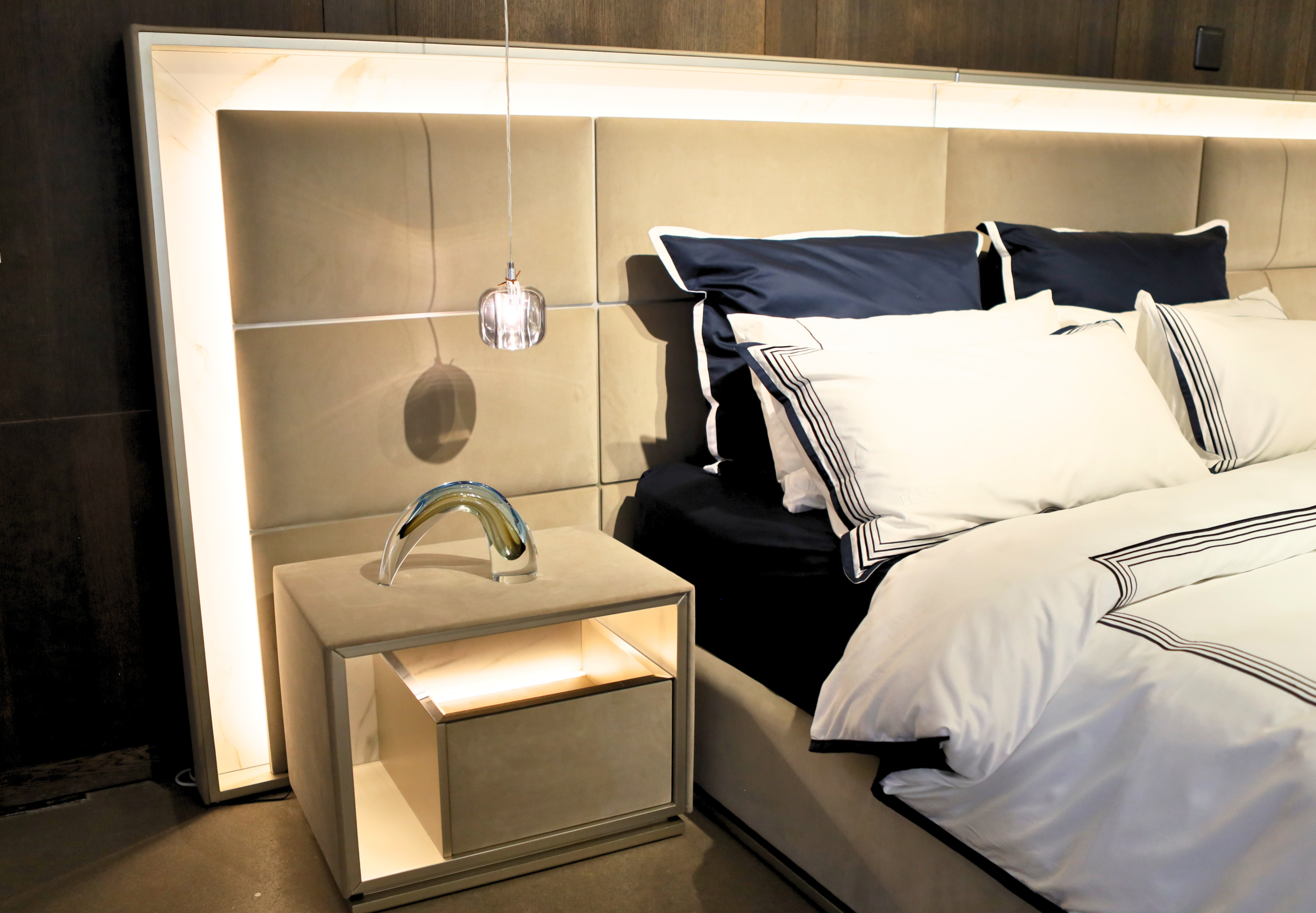 A softly structured bed that blends ambient lighting with refined Italian design, creating a calm and considered bedroom centrepiece.