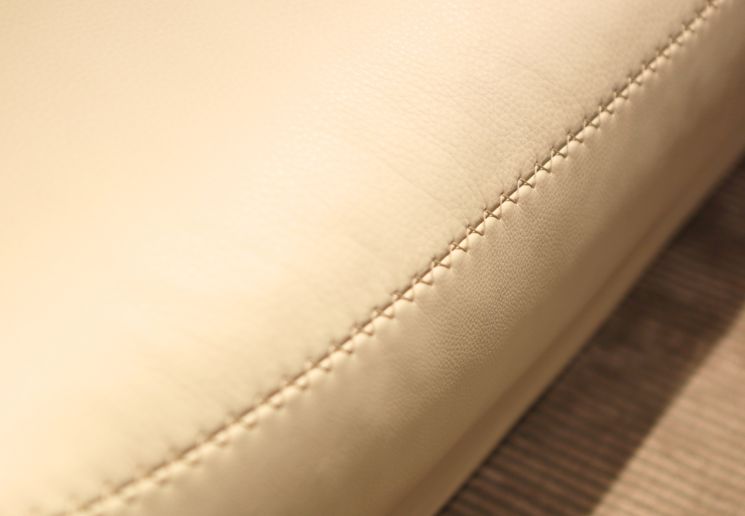 Upholstered in premium leather, the sofa showcases a refined texture and meticulous stitching that speaks to its craftsmanship. The soft, neutral tone enhances its versatility, allowing it to sit effortlessly within a range of interior palettes while maintaining a distinctly luxurious feel.