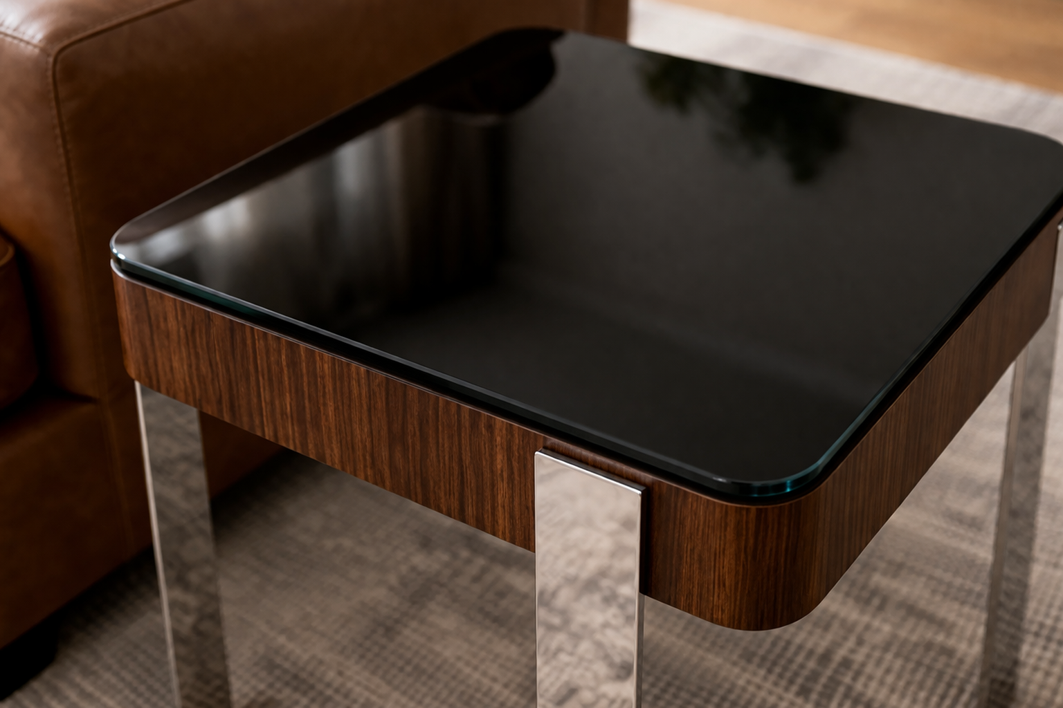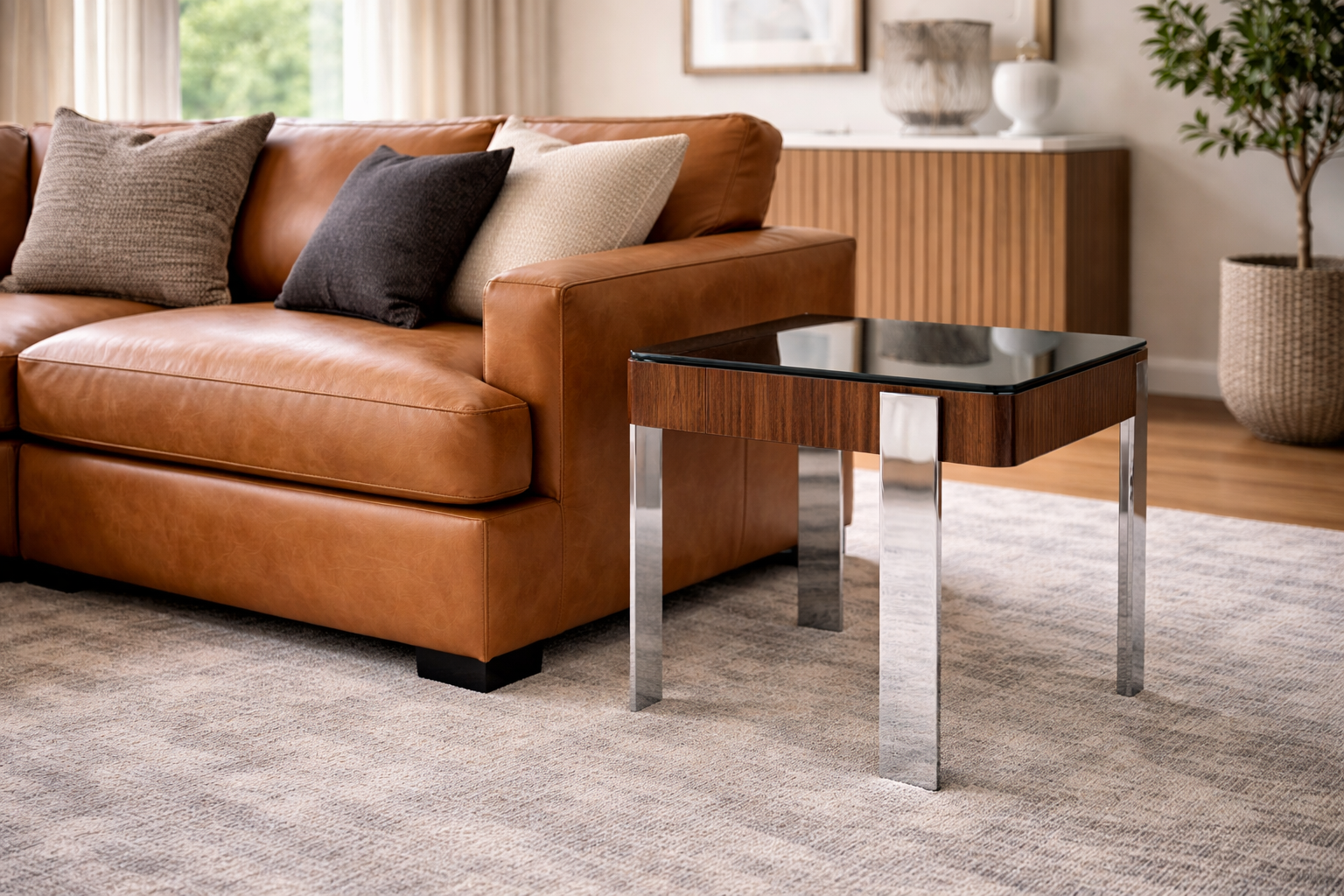 A modern side table combining warm wood with sleek chrome legs, offering a clean, structured look for contemporary interiors.