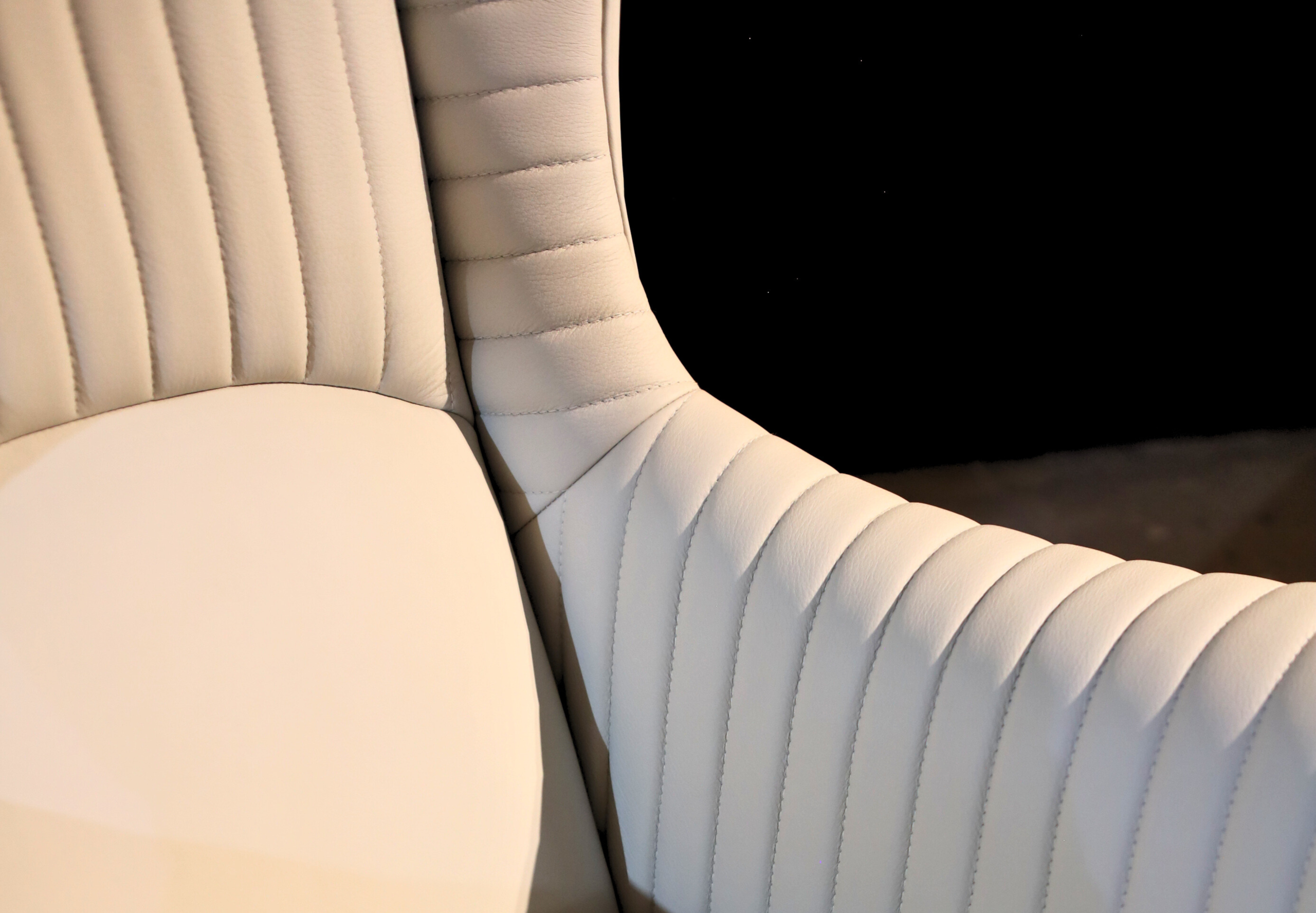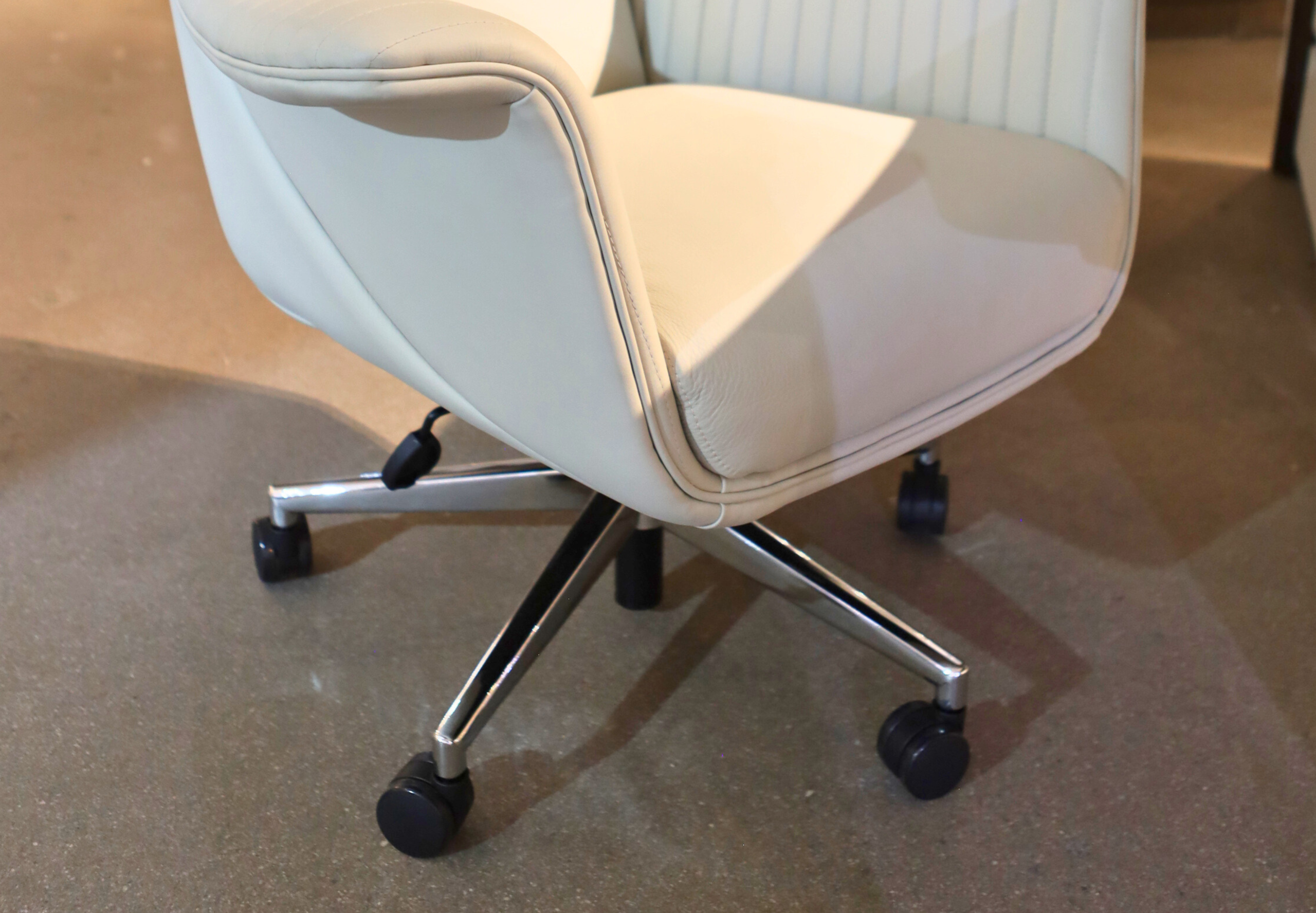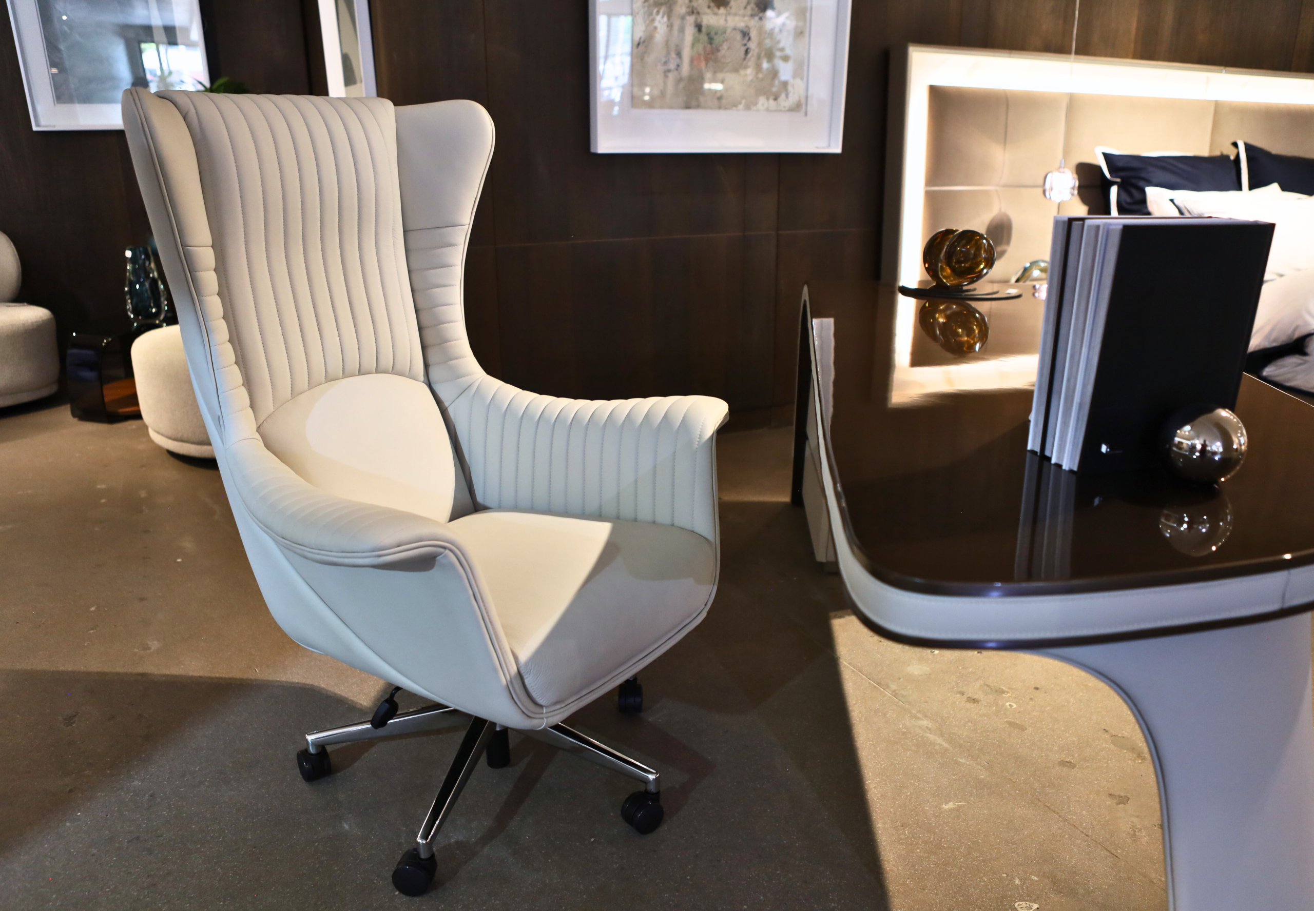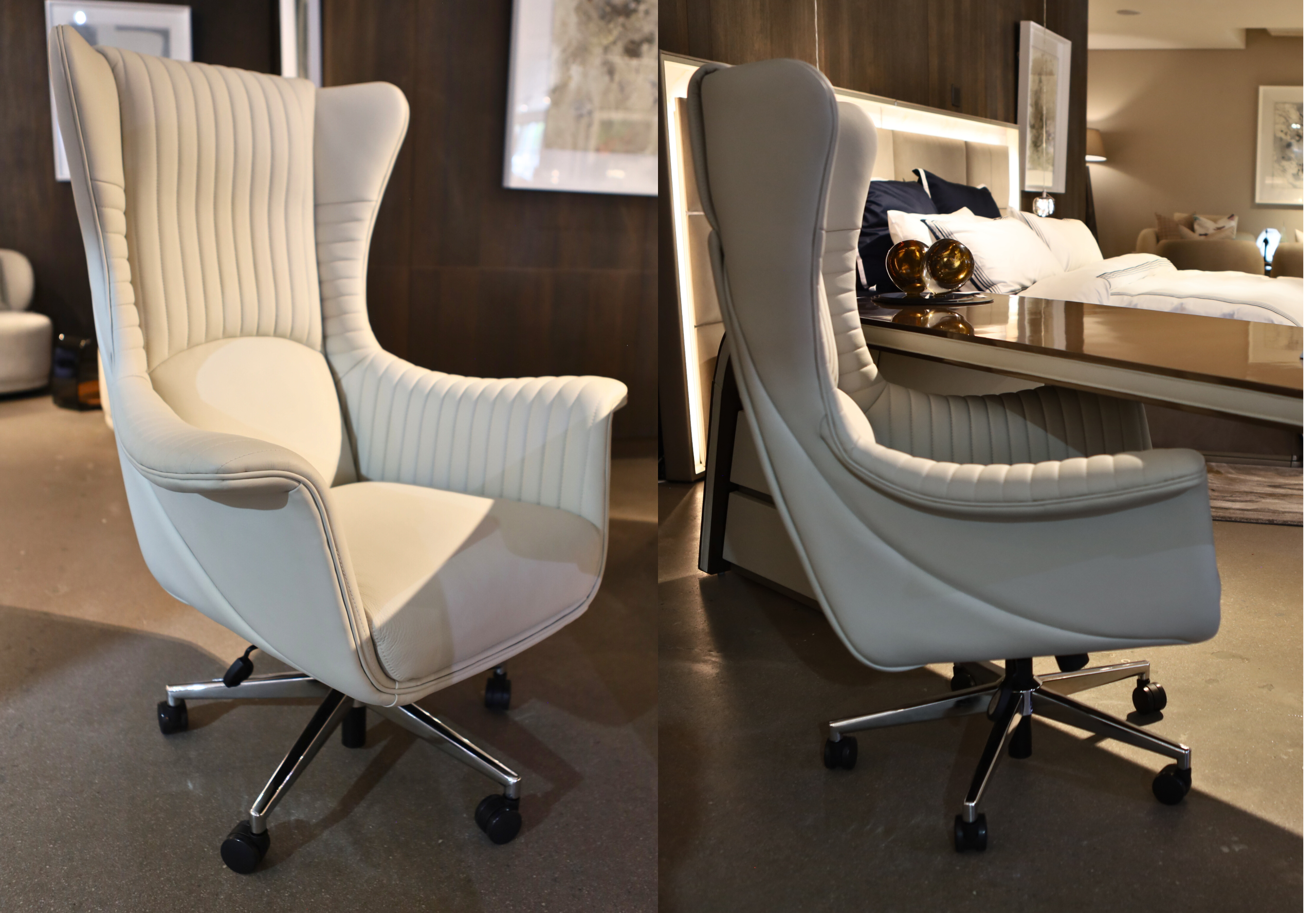 The Bugatti Office Chair is designed to complement the Bugatti Desk, combining sculptural form with ergonomic comfort. Its high-back silhouette creates a commanding yet refined presence, while vertical channel stitching introduces texture and tailored sophistication.