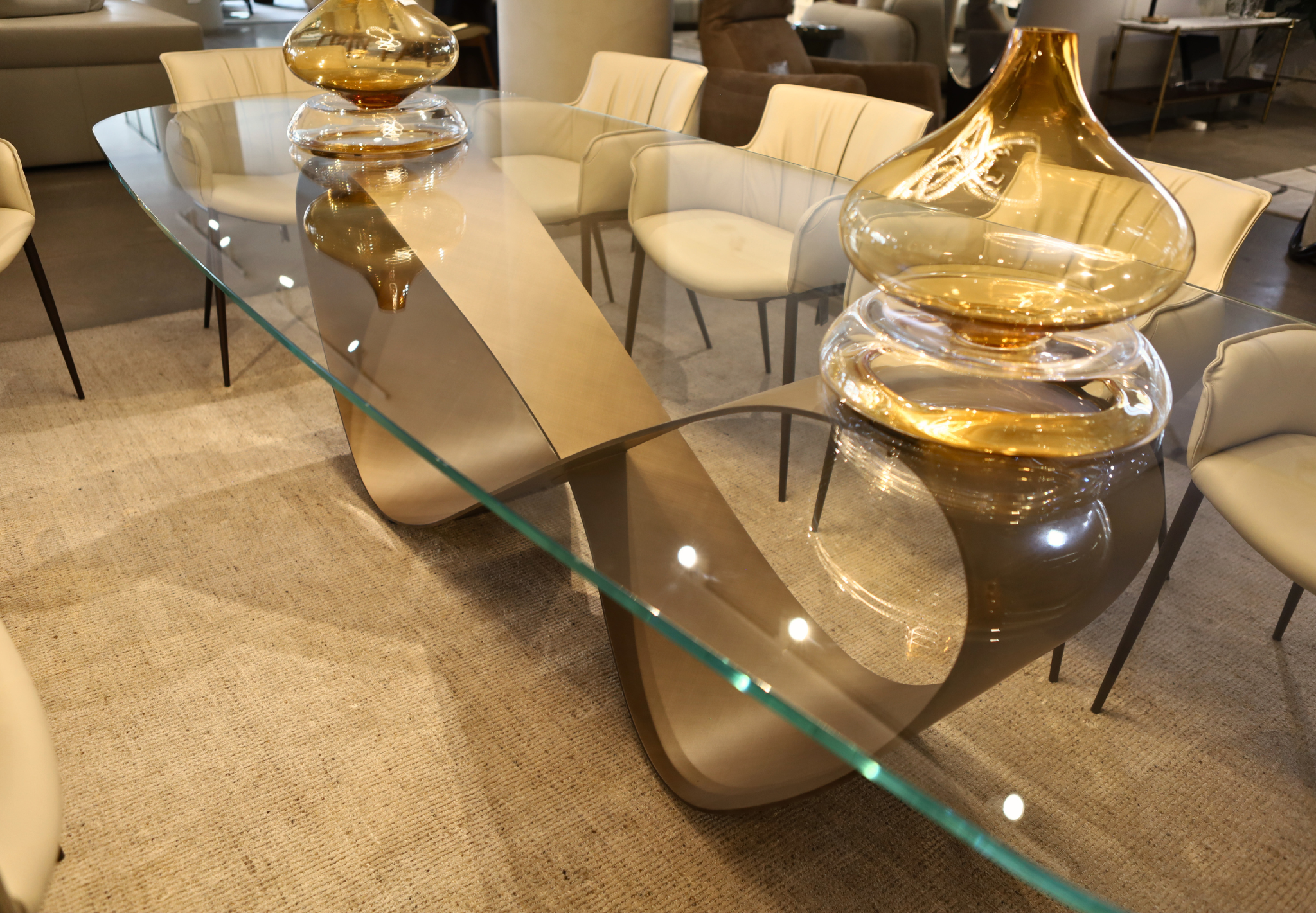 A sculptural glass dining table with a flowing, wing-inspired base.