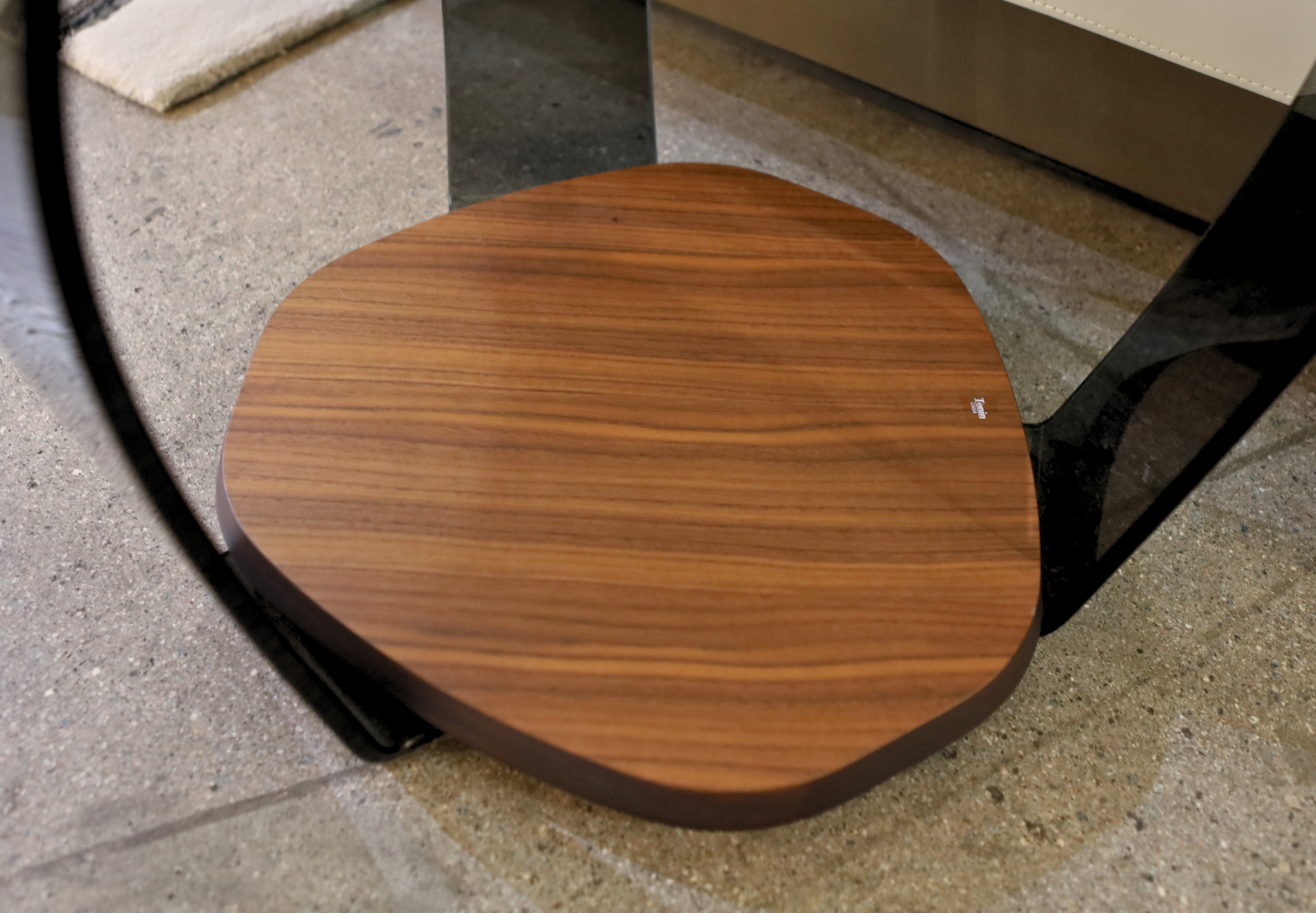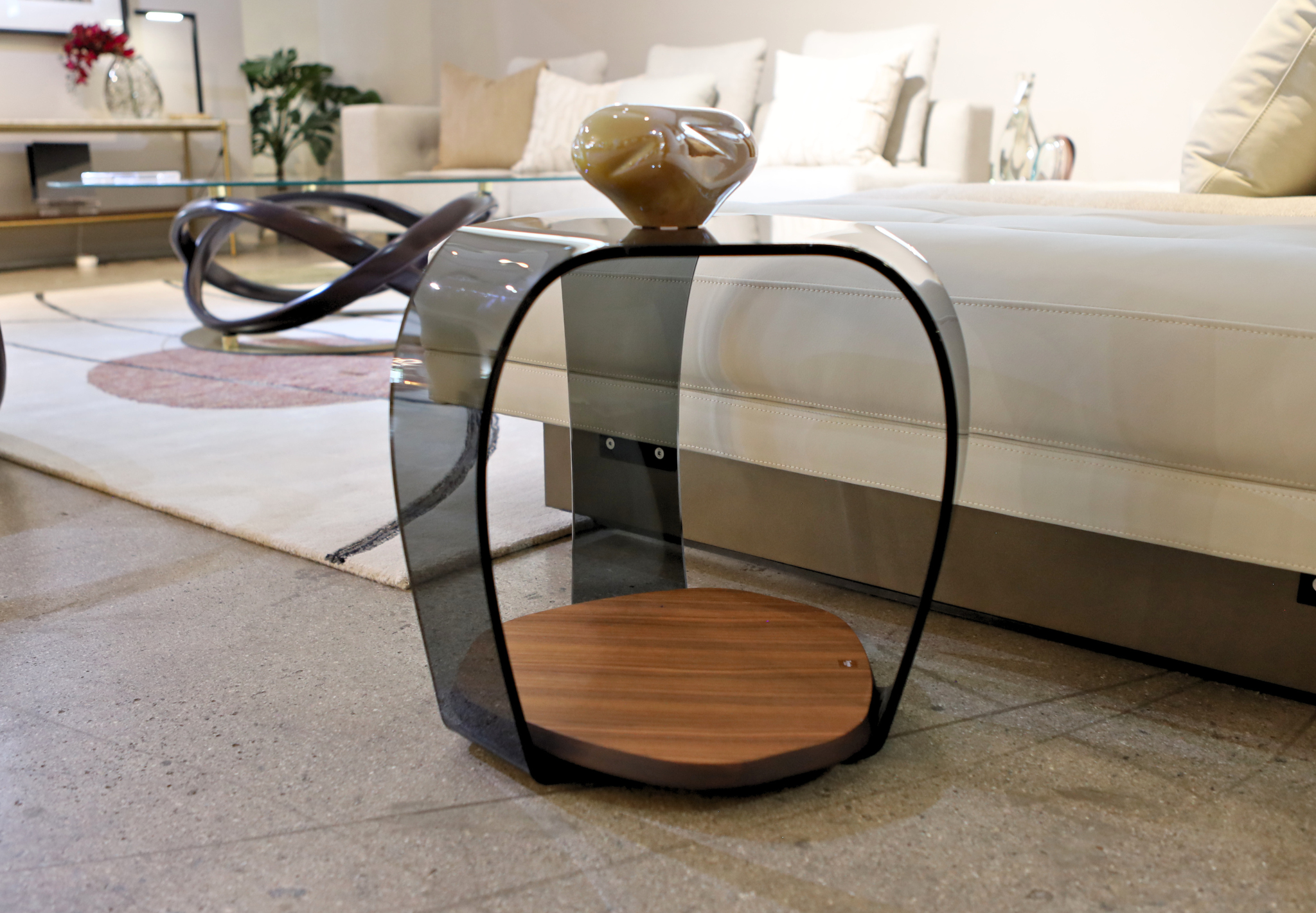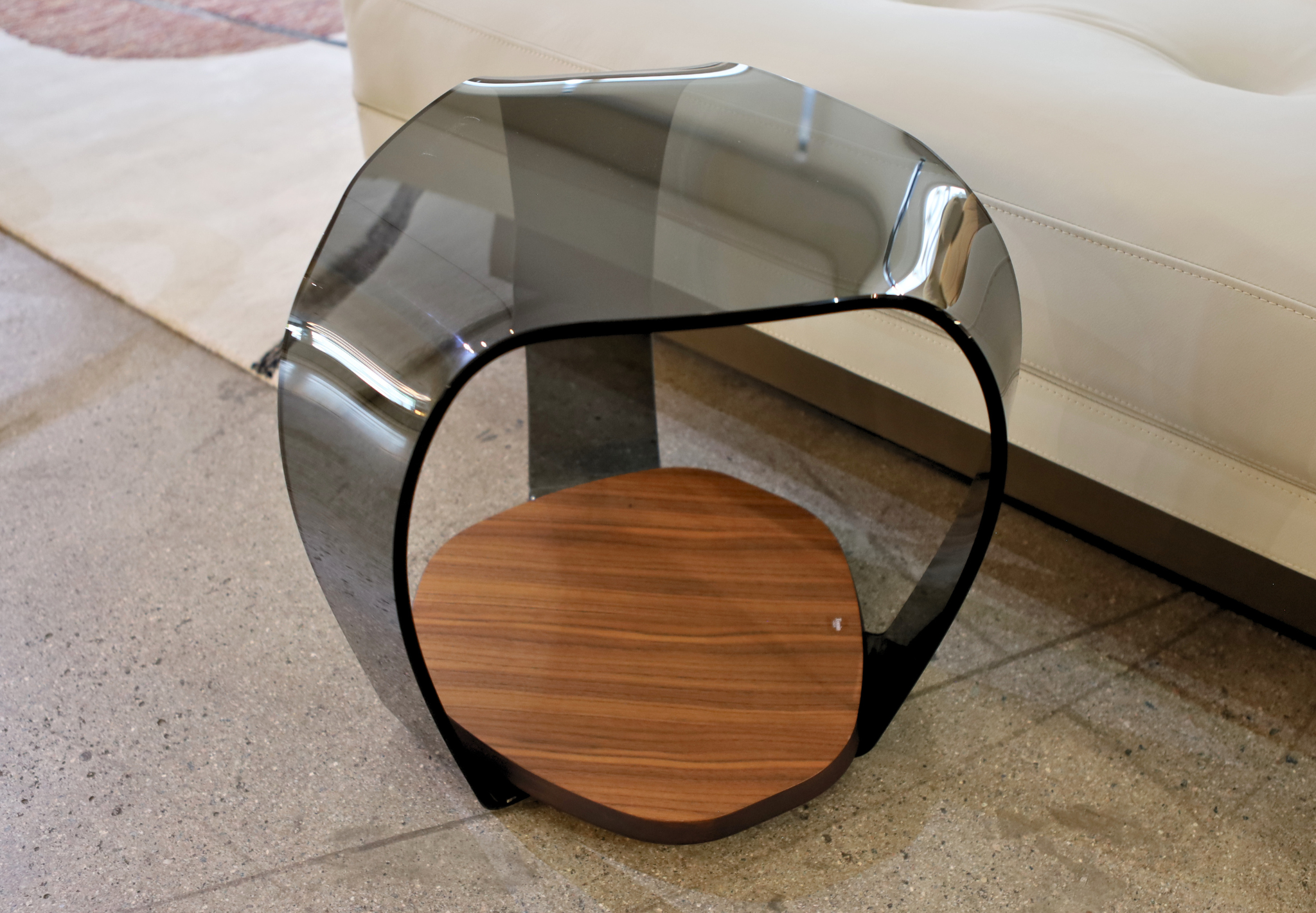 A sculptural smoked glass side table with a flowing form and wooden base, designed to add depth and modern elegance to any space.
