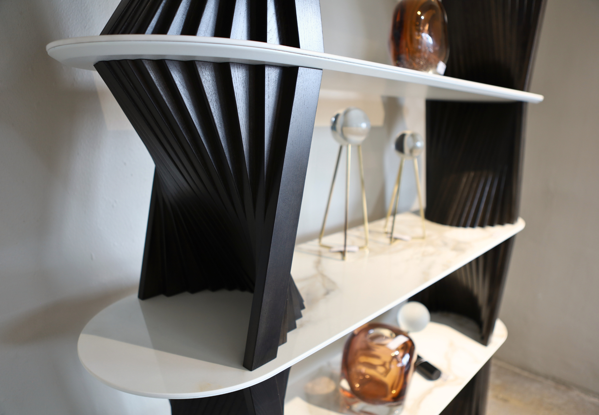 A sculptural display unit with twisted supports and modern shelving.