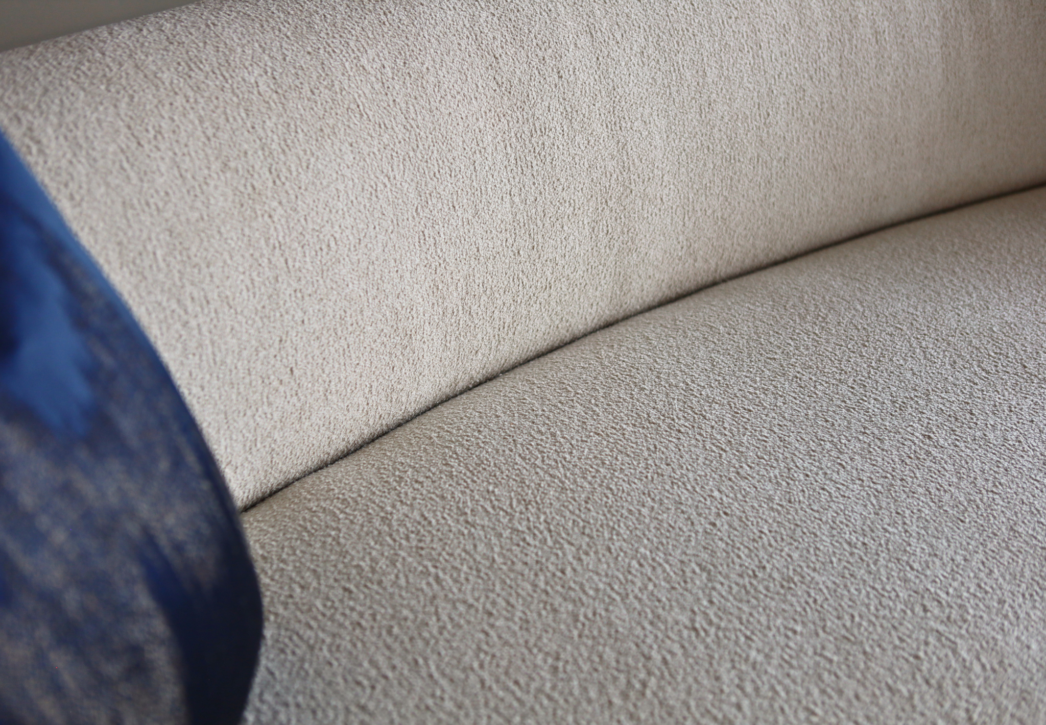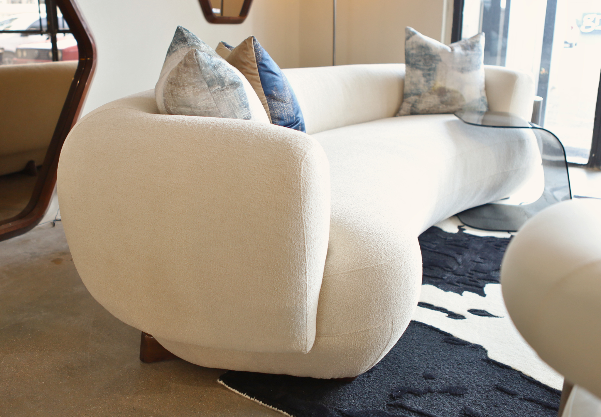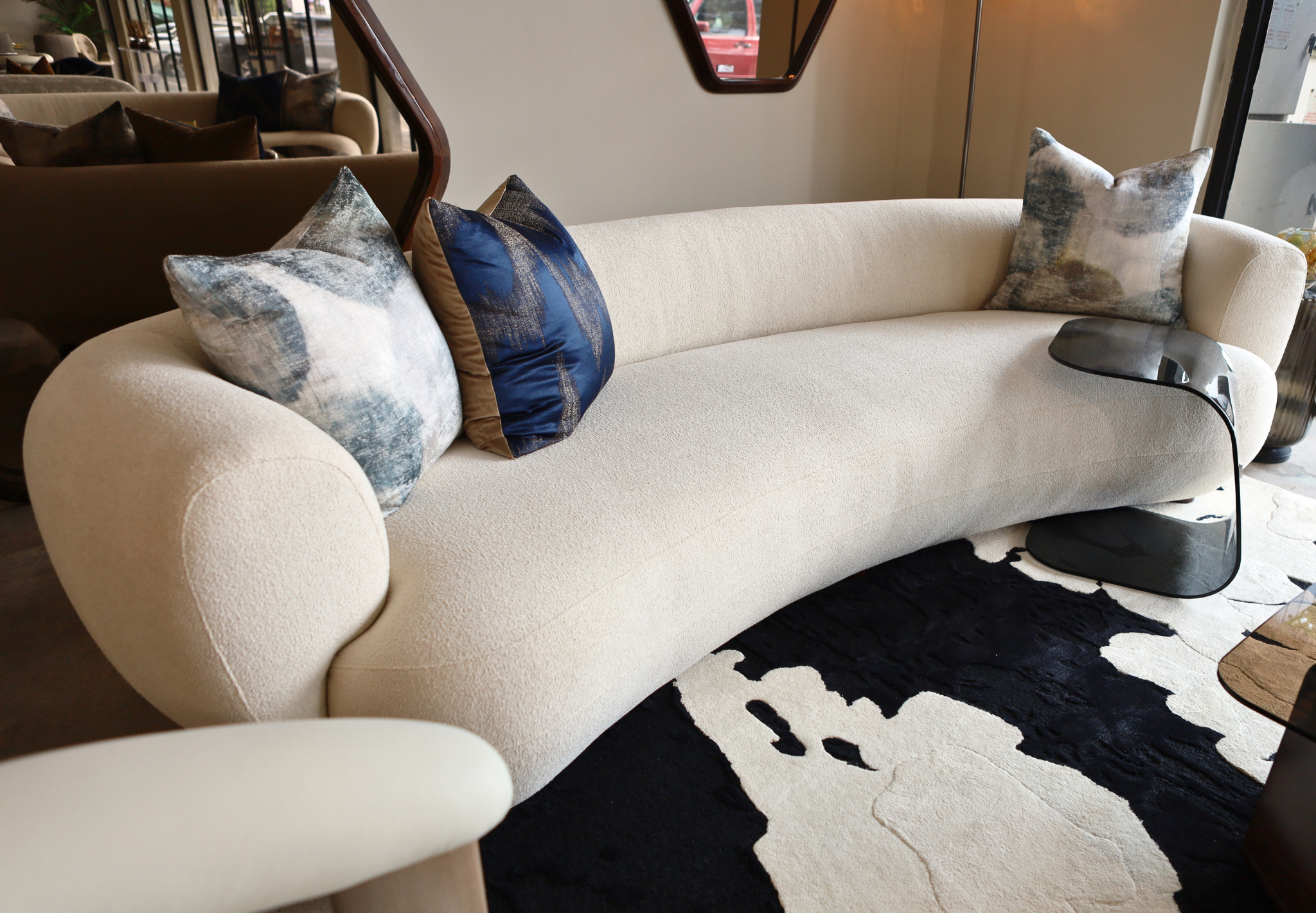 Its fluid, crescent shape creates a sense of movement within the space, making it ideal for open-plan interiors or statement living areas. Generously padded seating and rounded armrests enhance its comfort, while the seamless upholstery keeps the look refined and modern.