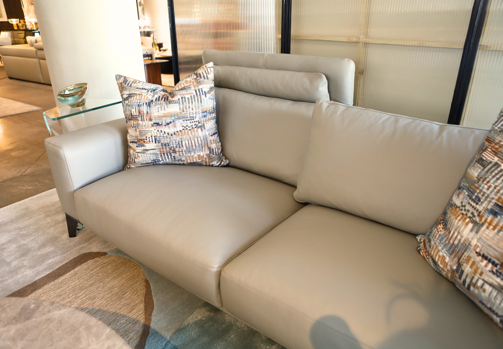 Upholstered in supple leather, the sofa offers a refined yet relaxed seating experience, with generous cushioning that supports without overwhelming. The structured armrests and slim legs provide contrast, giving the piece a light, elevated presence despite its substantial comfort.