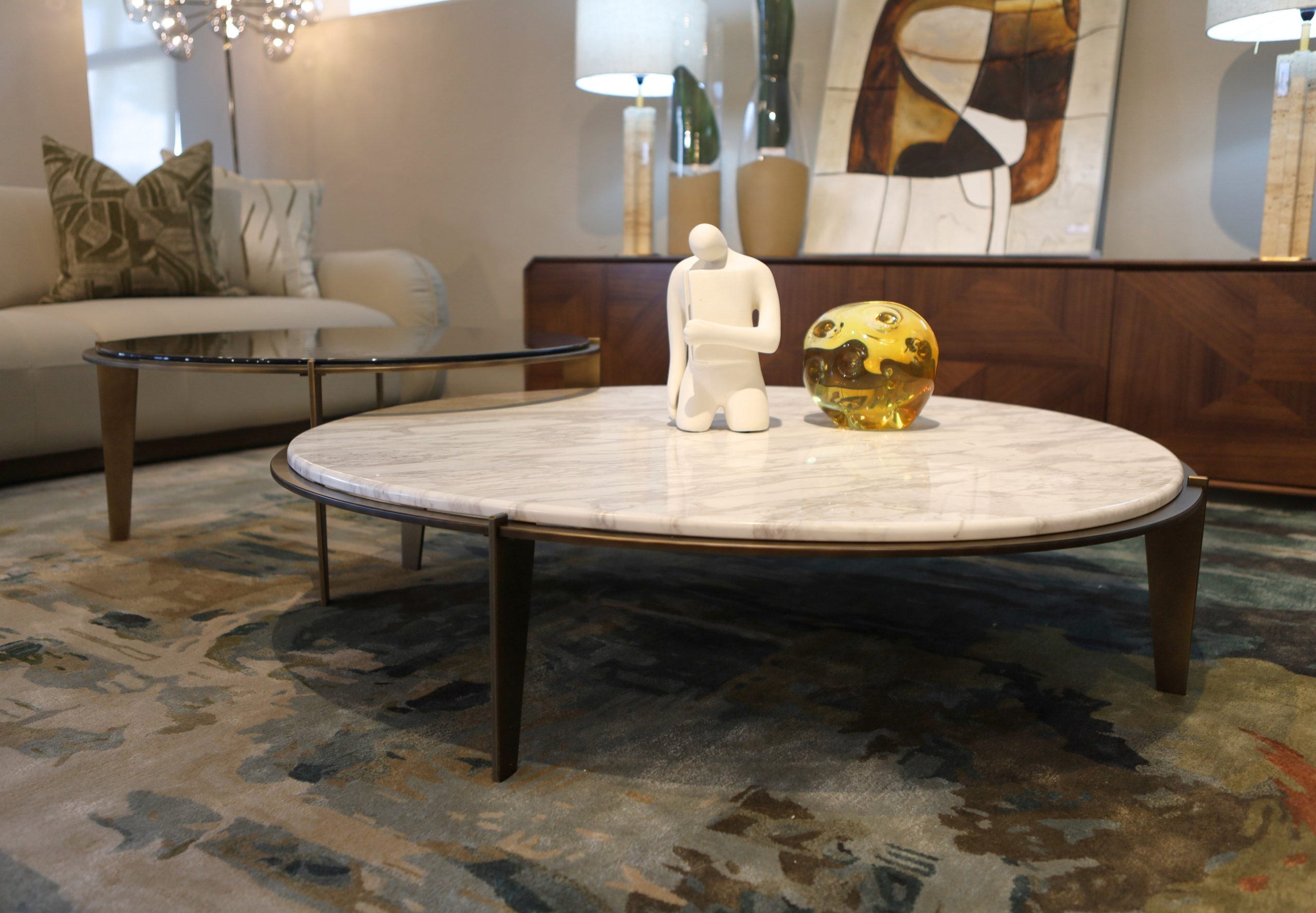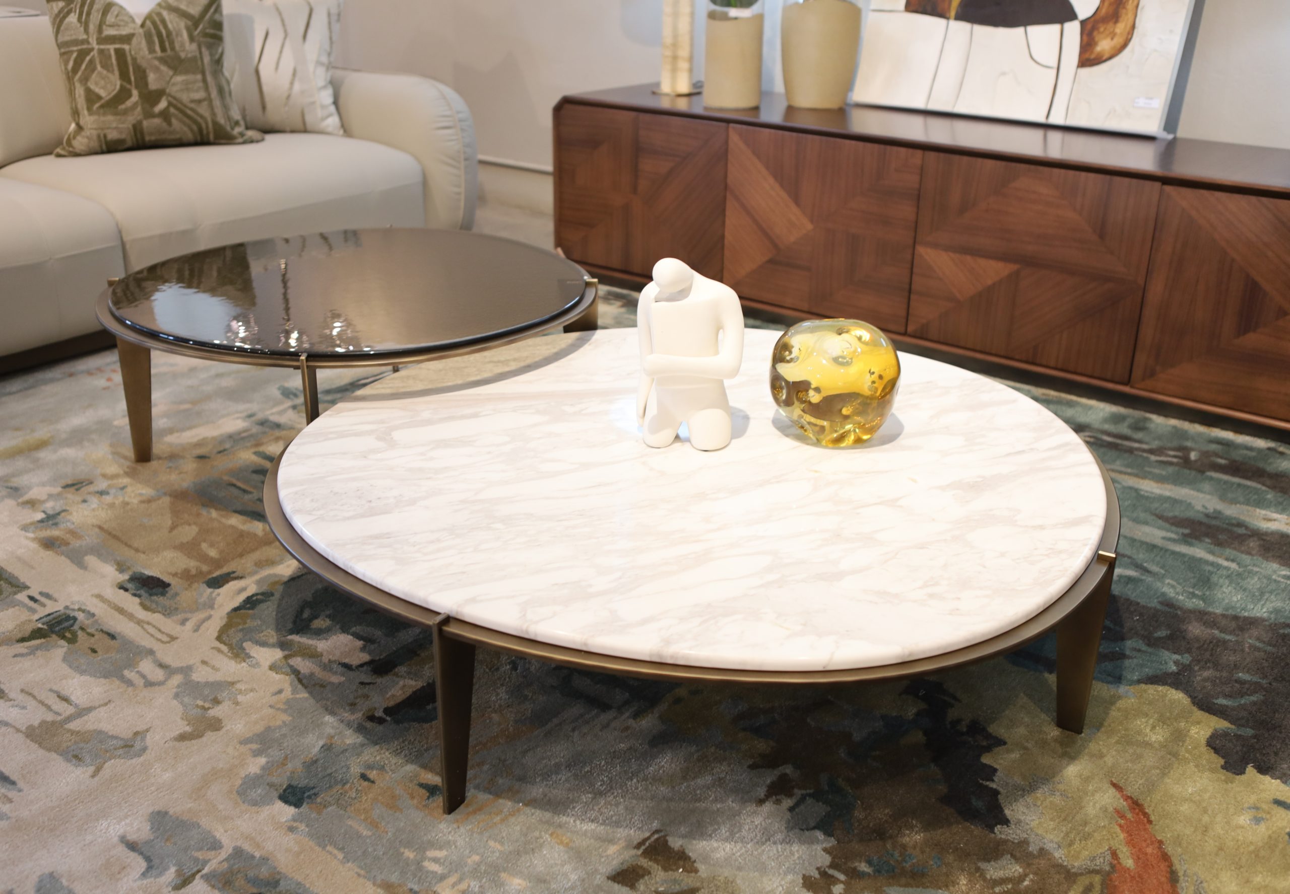 The Halo Coffee Table is a sculptural centrepiece crafted in glass and marble or porcelain, designed to bring lightness and refinement to contemporary living spaces.