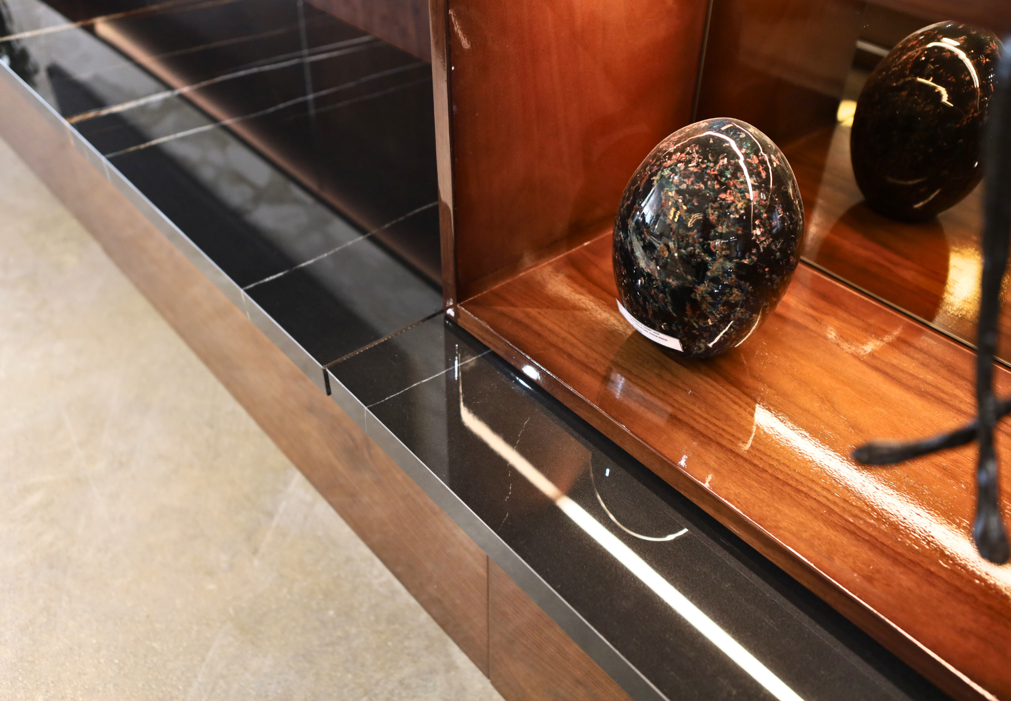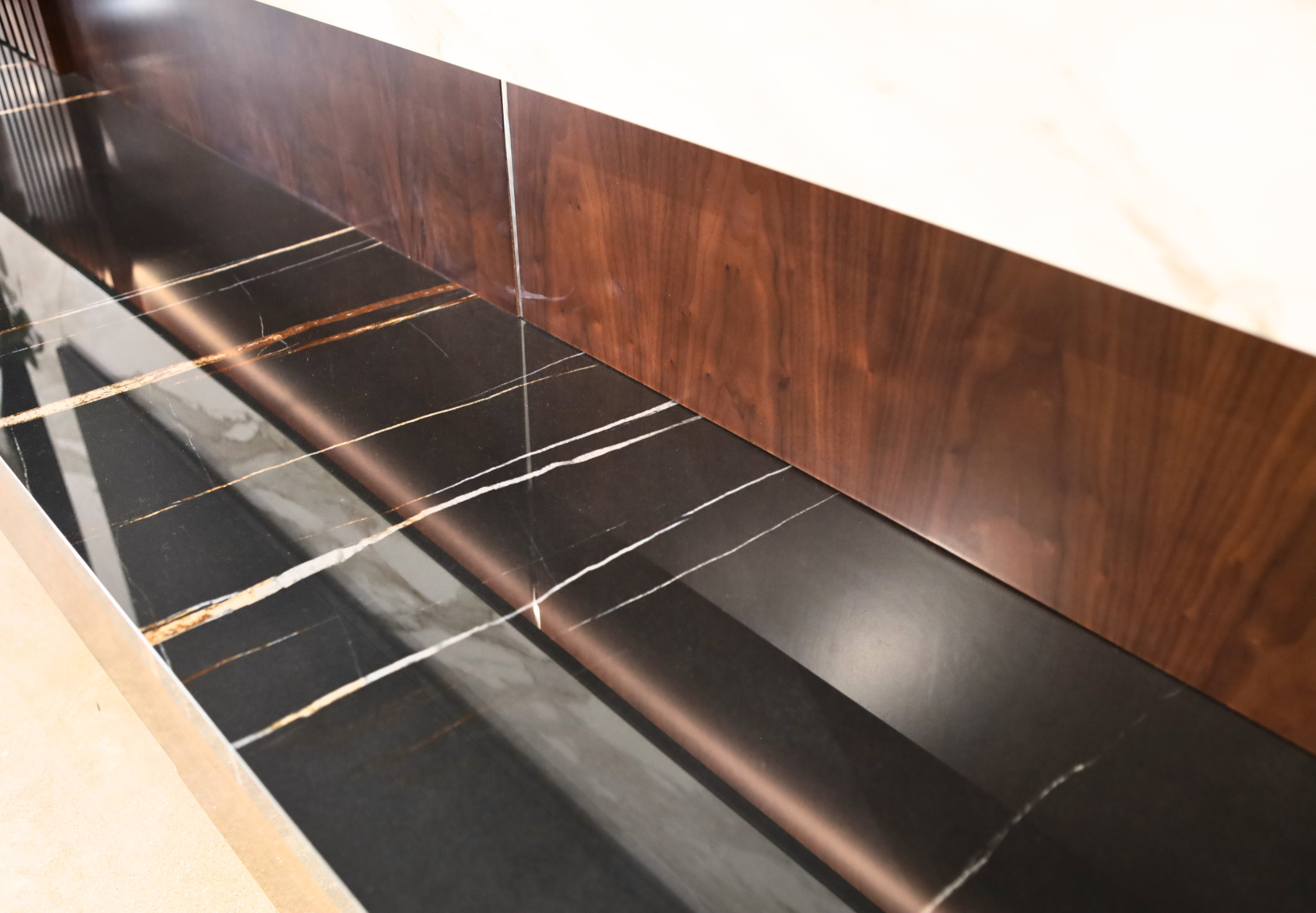 At its centre, a large marble panel introduces a sense of grandeur, its natural veining adding movement and depth. Integrated shelving with soft lighting creates a gallery-like display for curated objects, while the low-profile base offers practical storage without disrupting the clean lines.