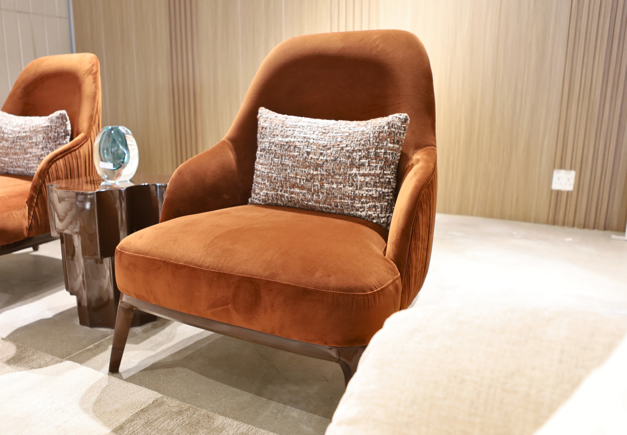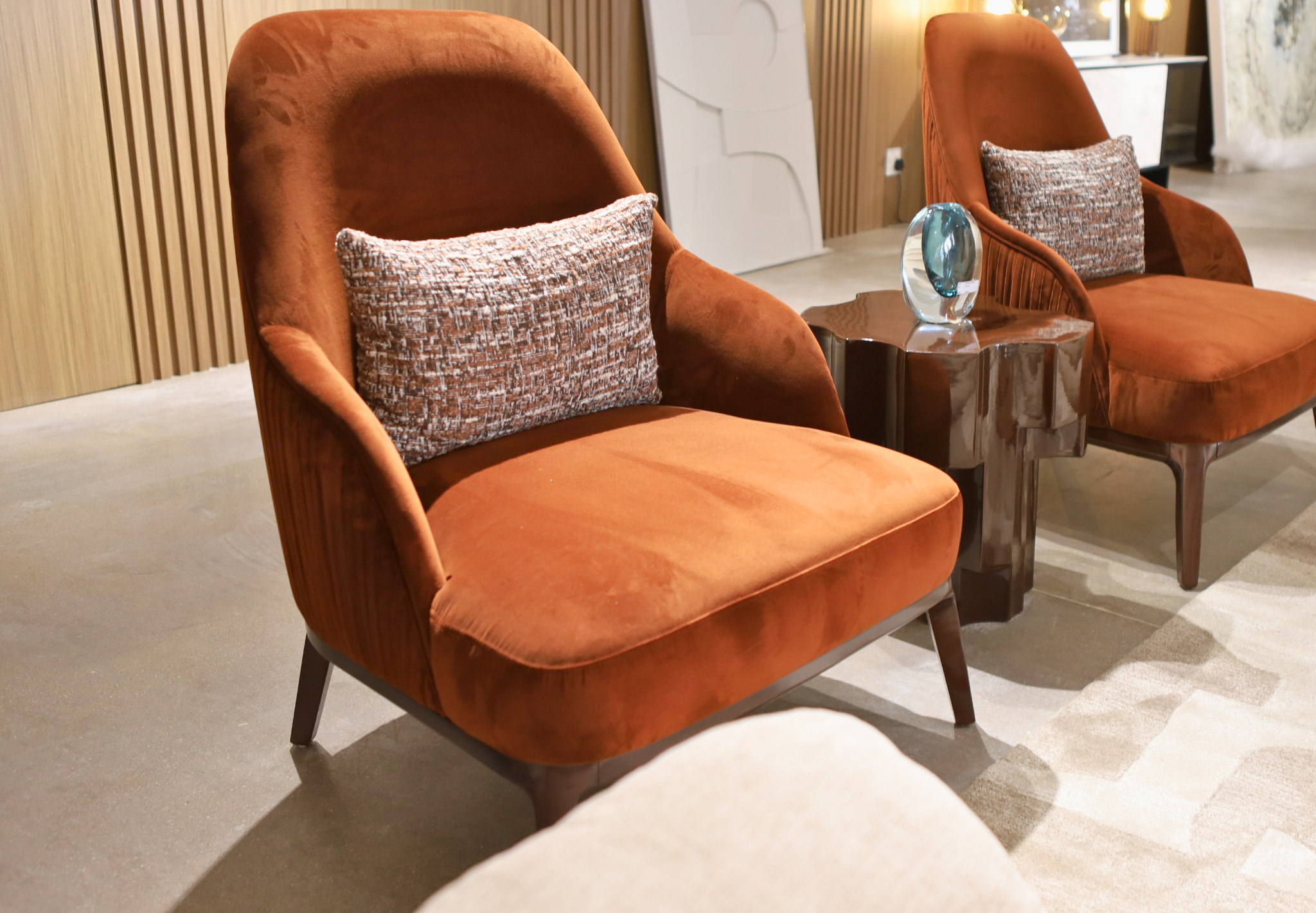 A plush, sculpted occasional chair with warm tones and refined detailing.
