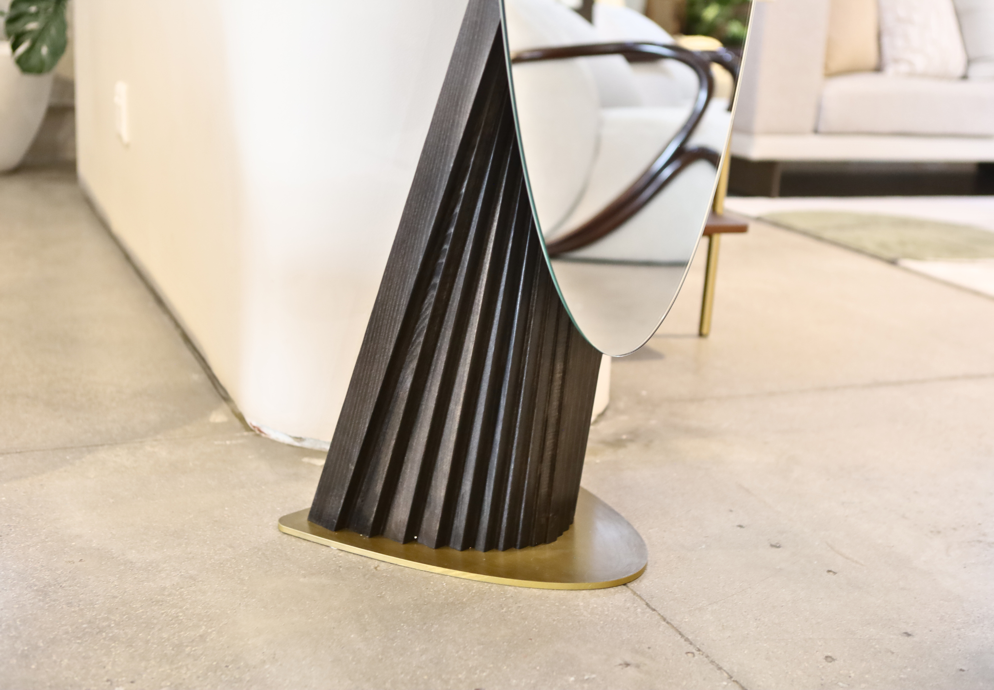 The Moonlight Mirror is a celebration of form, texture, and proportion. Designed as a freestanding statement, its softly elongated oval mirror is supported by a dramatic, vertically fluted base finished in a deep, moody tone. The contrast between the smooth reflective surface and the sculptural base gives the piece its distinctive presence.