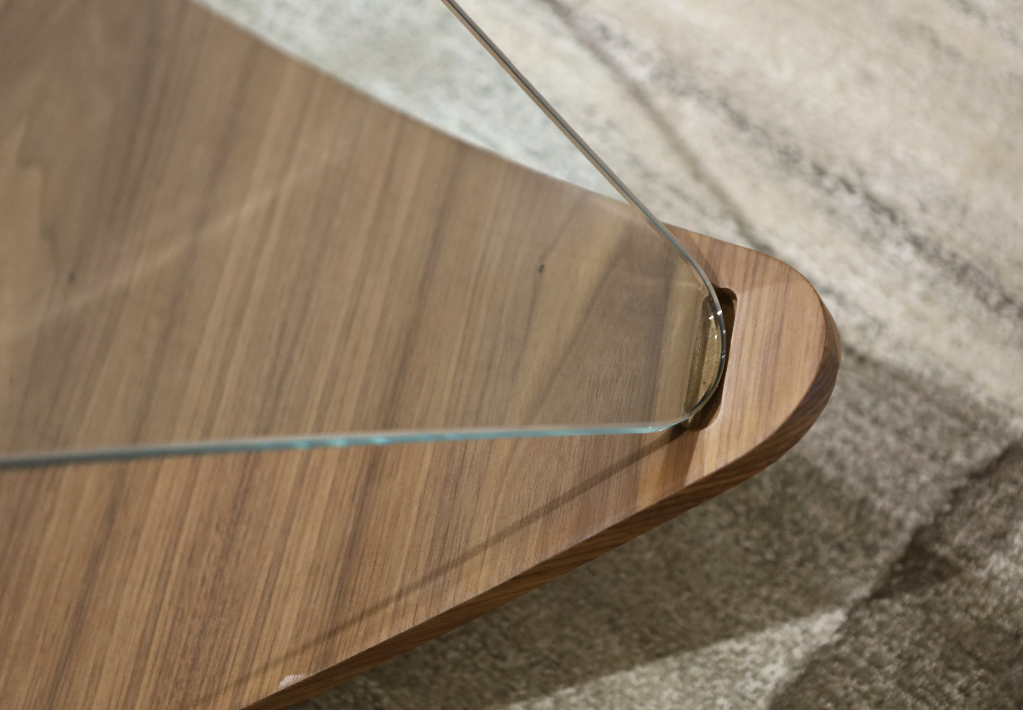 The Quiet Coffee Table is a sculptural centerpiece that effortlessly blends craftsmanship with contemporary design. Defined by its fluid, triangular form, the table features a beautifully curved wooden base that appears to fold and flow beneath a sleek glass top.